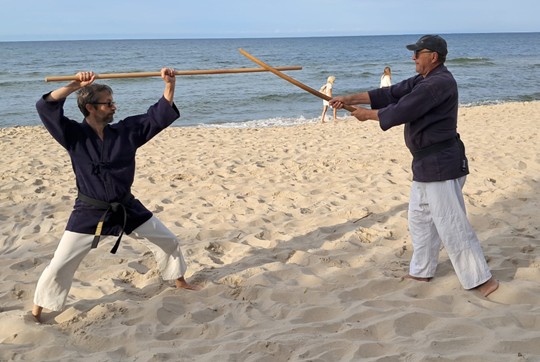 Fot. - Warsztaty Shibu Kobudō, lato 2024 – shihan Stanisław Cynarski (uke-dachi) i shihan Wojciech J. Cynarski (uchi-komi) – zaawansowane formy techniczne bōjutsu.